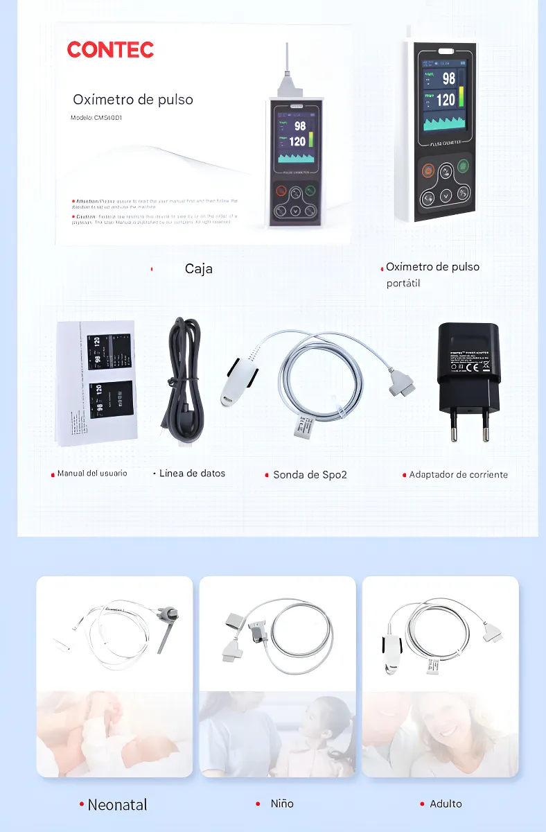 Oxímetro Profesional Contec CMS60D1 – Kit Completo 3 Sondas (Neonatal, Niño, Adulto) + Software