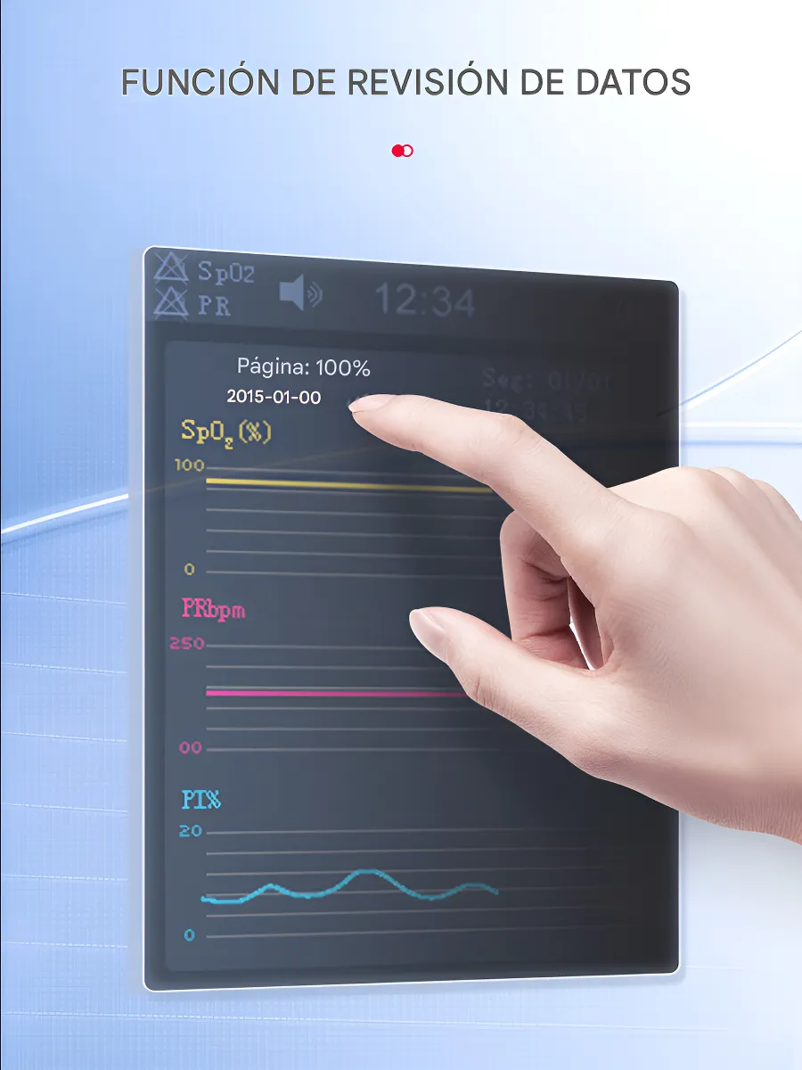 • Sistema de Alarmas Inteligente: Configure límites máximos y mínimos. Si el paciente se sale de los rangos seguros o si el dedo se sale de la sonda, el equipo emitirá una alerta visual y sonora inmediata.