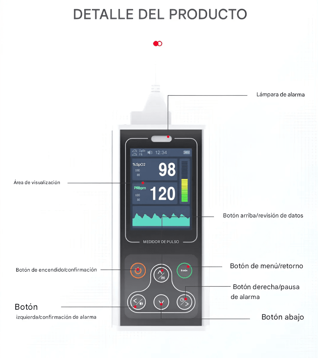 • Pantalla de Alta Definición: Panel a color de 2.8″ con brillo ajustable. Muestra SpO2, Frecuencia Cardíaca (PR), Barra de Pulso y Curva Pletismográfica en tiempo real.