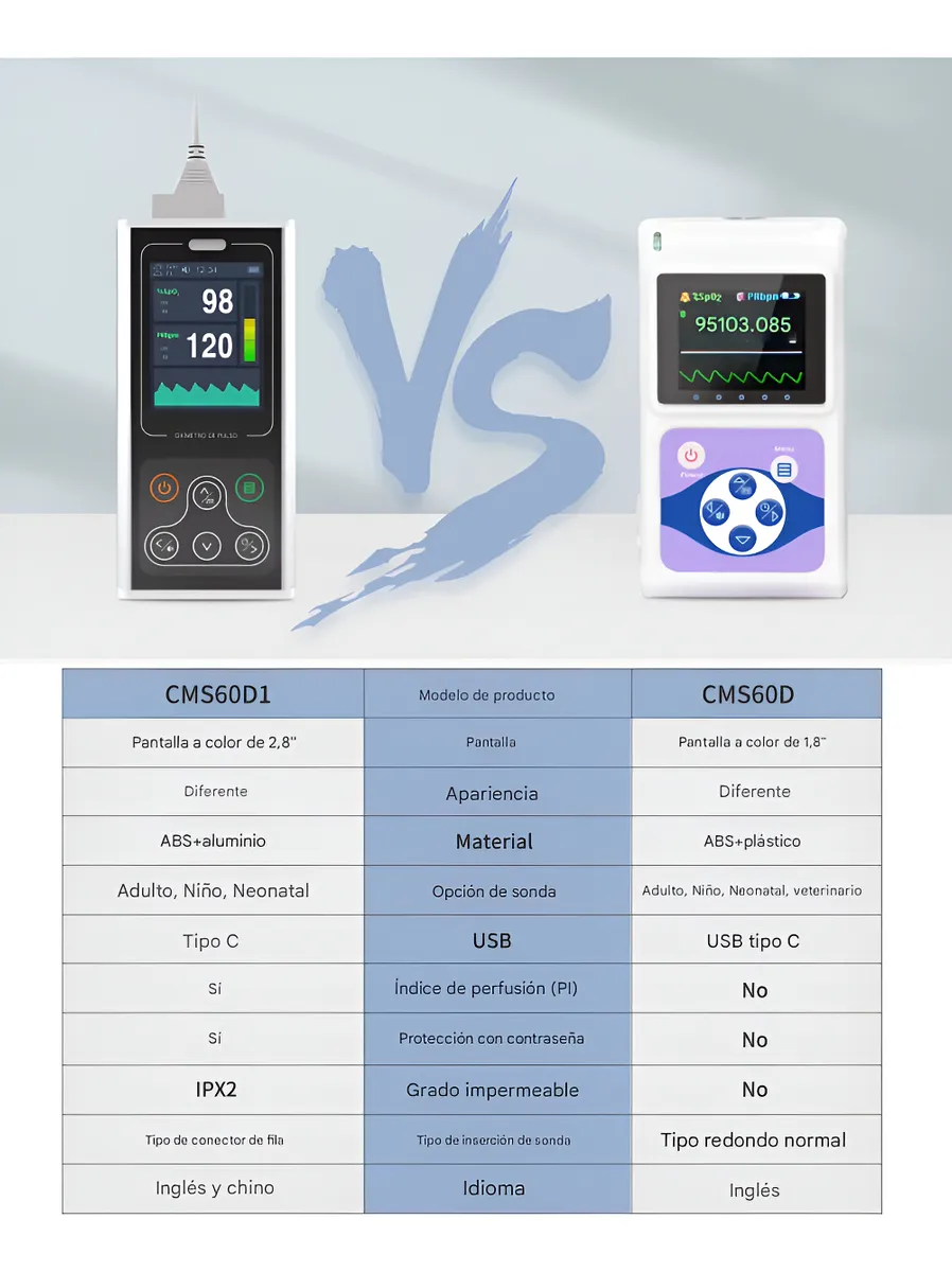A diferencia de los oxímetros de dedo convencionales, el CMS60D1 cuenta con una unidad central de procesamiento con pantalla gigante de 2.8 pulgadas, lo que permite visualizar gráficos, tendencias y menús de configuración con total claridad.