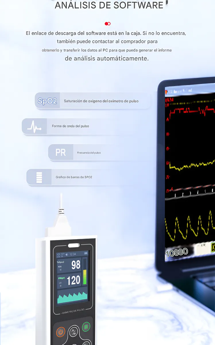 El CMS60D1 no solo mide, también documenta. Cuenta con memoria interna para almacenar registros de SpO2 y PR. Además, gracias a su conexión USB y software incluido, podrá descargar los datos al computador para generar informes médicos, analizar tendencias de sueño o llevar un historial clínico detallado.